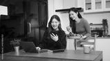 Two Asian women are sitting at a kitchen table, learning online at home. They smile happily while using laptops, surrounded by fruits and a coffee cup, enjoying their time