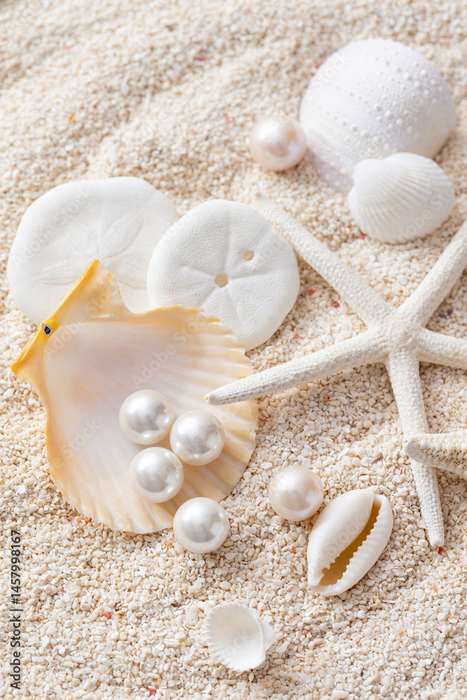 A close-up of starfish, pearls, sea urchins and shells on the beach.