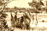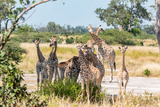 wildlife of moremi national park in botswana: giraffe family looking for shade in typical landscape