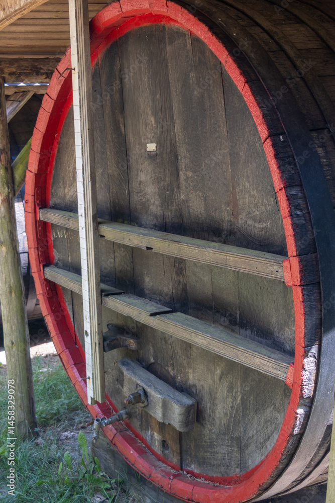 Old barrel with alcoholic beverage in the countryside