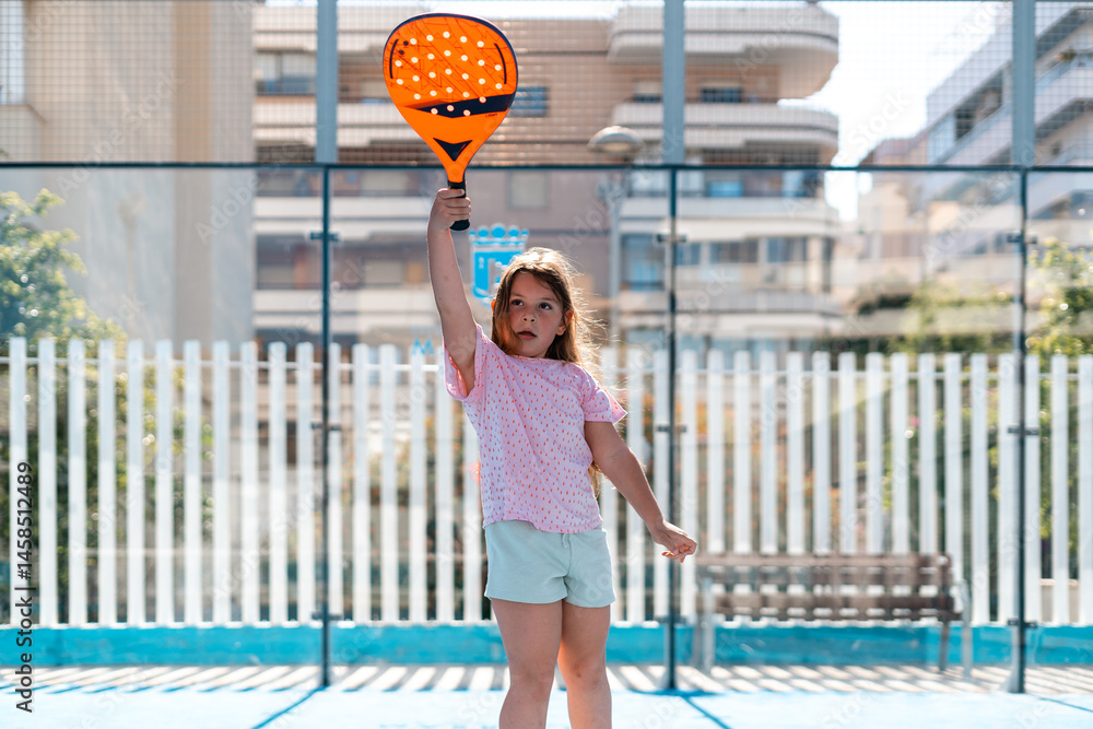 Young girl playing paddle tennis, vibrant outdoor court scene.