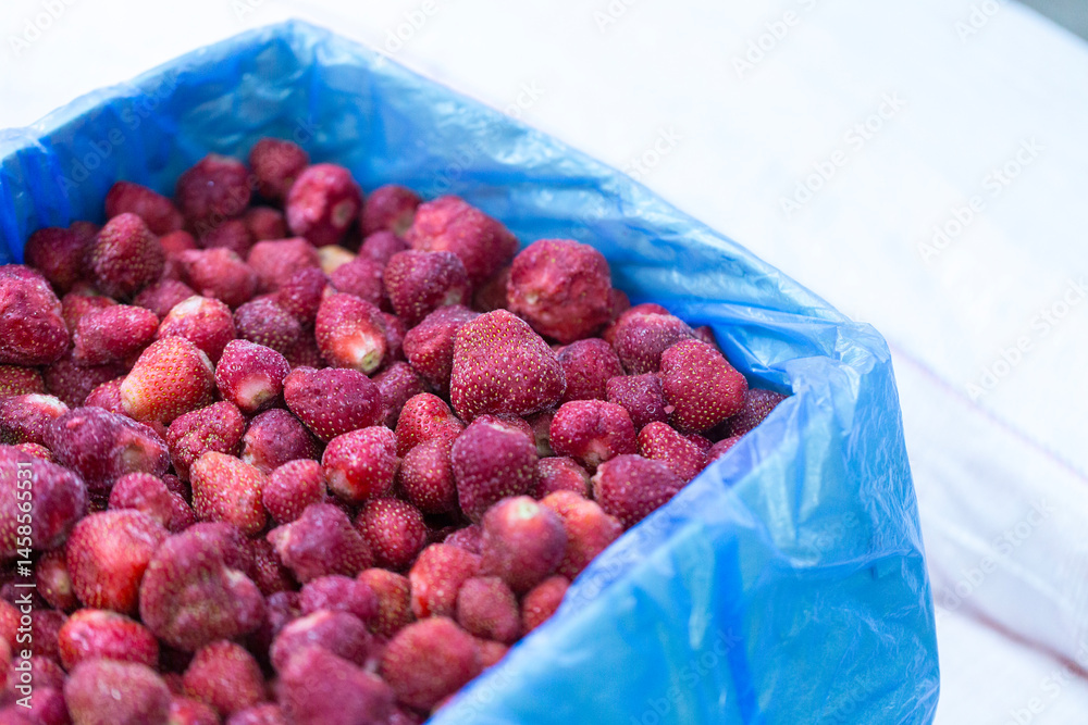 Close-up of shock-frozen strawberries with a thin ice coating. Are prepared for retail packaging to ensure extended shelf life in supermarkets and maintain perishable harvest quality.
