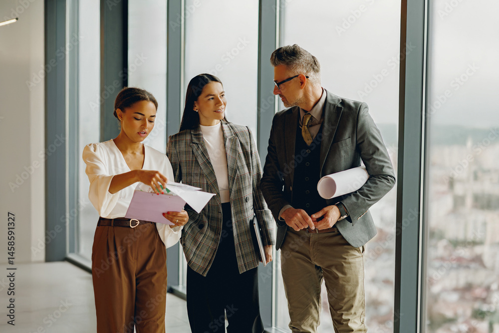 A skilled team discusses project details in a modern office that promotes creativity and collaboration