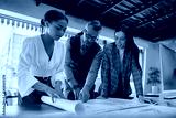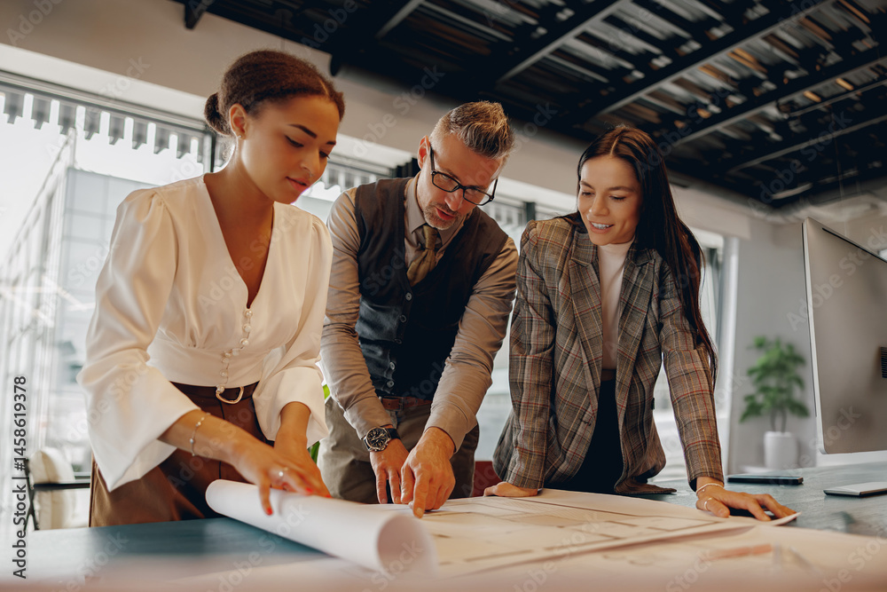 Three skilled professionals engaged in strategizing and discussing blueprints within a modern office environment