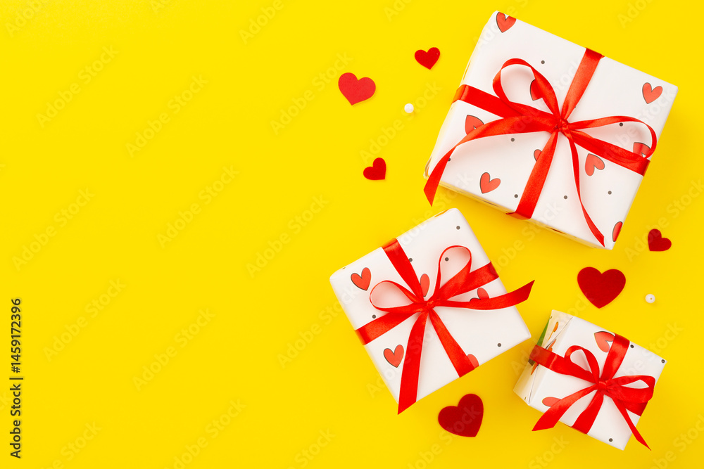 Festive gift boxes with red hearts on color background, top view