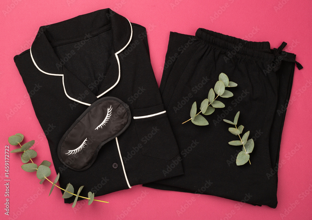 Black trendy pajamas, sleeping mask and accessories on color background, top view