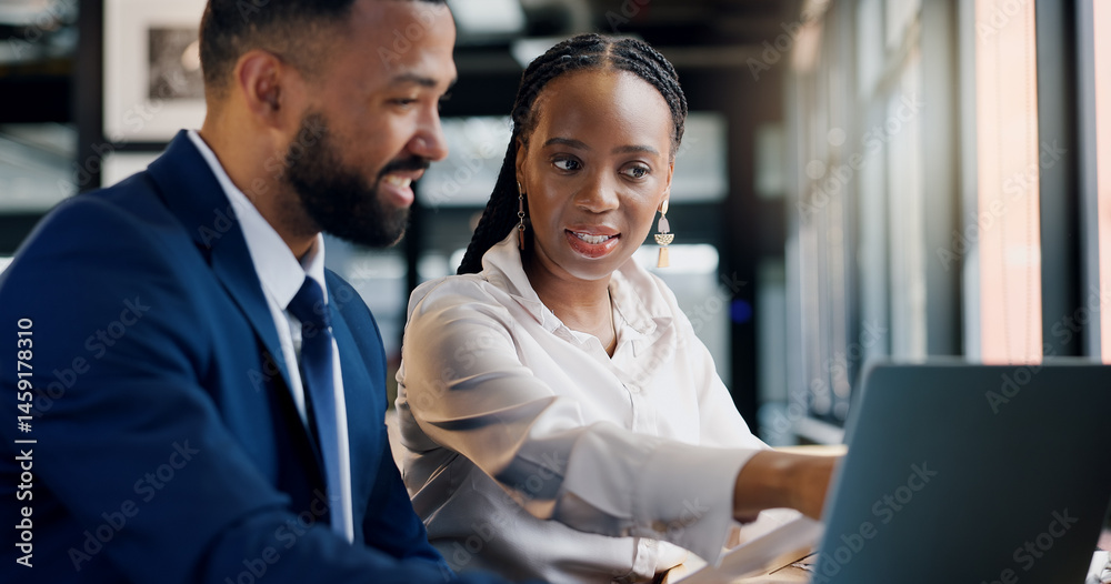Woman, man and laptop for meeting at cafe with discussion, review or happy for project management. People, computer and consulting for business plan with proposal, questions and advice at coffee shop