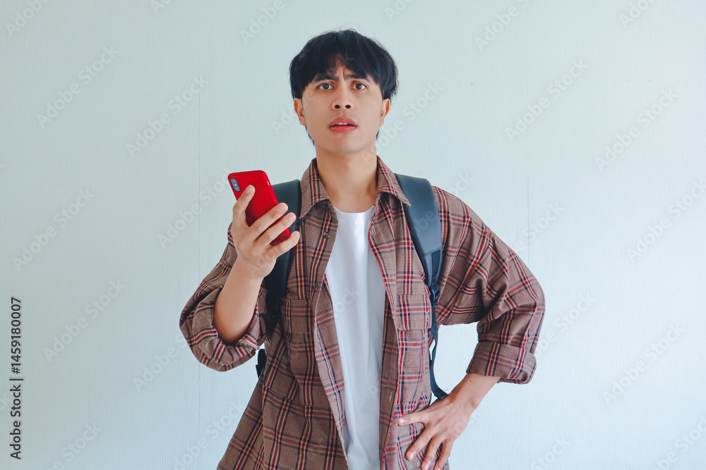portrait of male student wearing backpack looking camera with shocked expression while hold mobile phone on white background