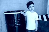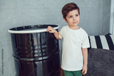 Little smiling boy in white t-shirt standing on loft studio background. Mock up.