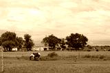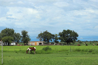 Landscape of a horse grazing in an Argentine countryside with a farm and cattle in the background