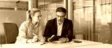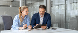 Team leader explain trainee working process using tablet pc computer. Two professional business people working together. Partners mature man, woman discussing project in office workplace. Copy space