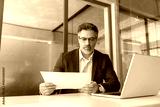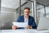Busy latin mature business man working on laptop computer reading financial document report in office. Entrepreneur manager businessman banking analyst doing paperwork analysing using pc. Copy space