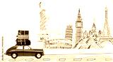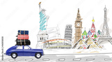 Around the world. Blue retro toy car with travel cases driving by famous monuments.