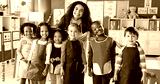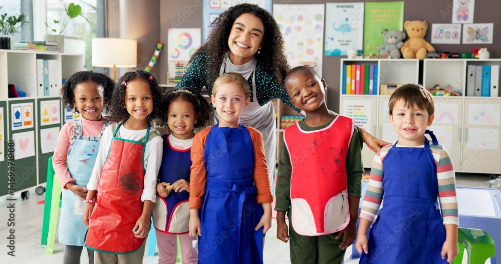 Happy children, portrait and teacher with students at kindergarten school for elementary education. Group, educator or kids with smile for fun learning, creativity or childhood development in class