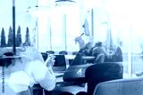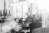 Back view. Silhouettes of two young women sitting in an office at table. First girl holds pen,second uses smartphone.