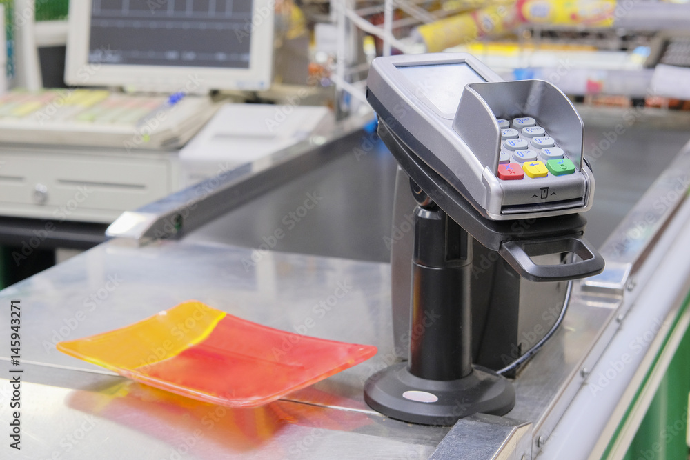 Kaluga, Russia - April, 21, 2017: Interior of a checkout point in supermarket in Kaluga, Russia