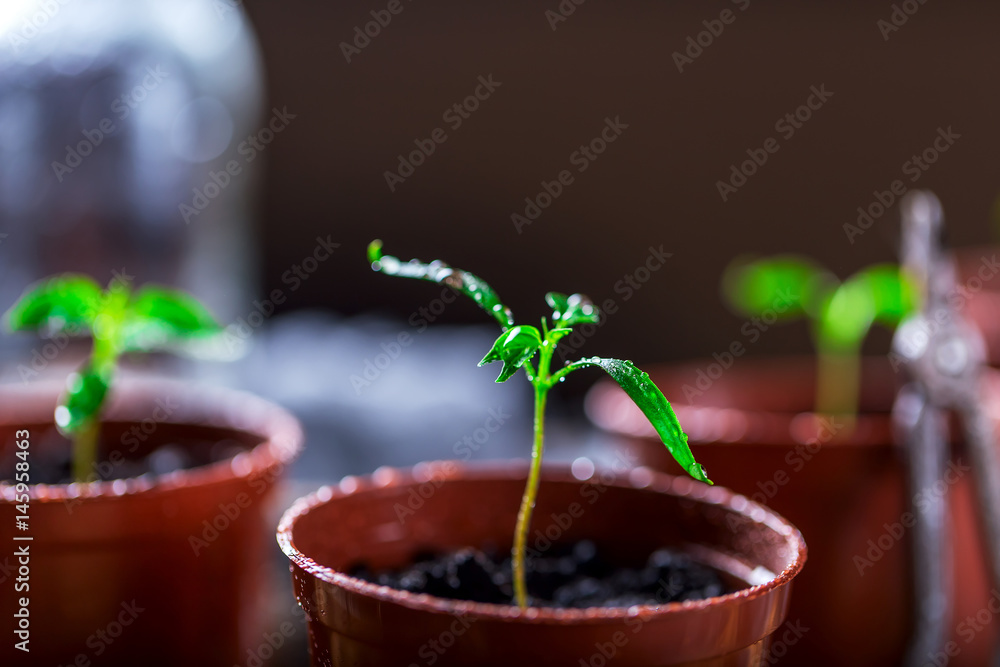 Young green plant with drops of water