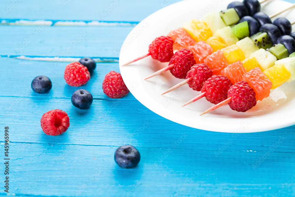 Fresh summer fruits on blue wooden table