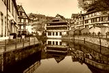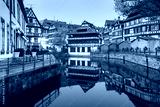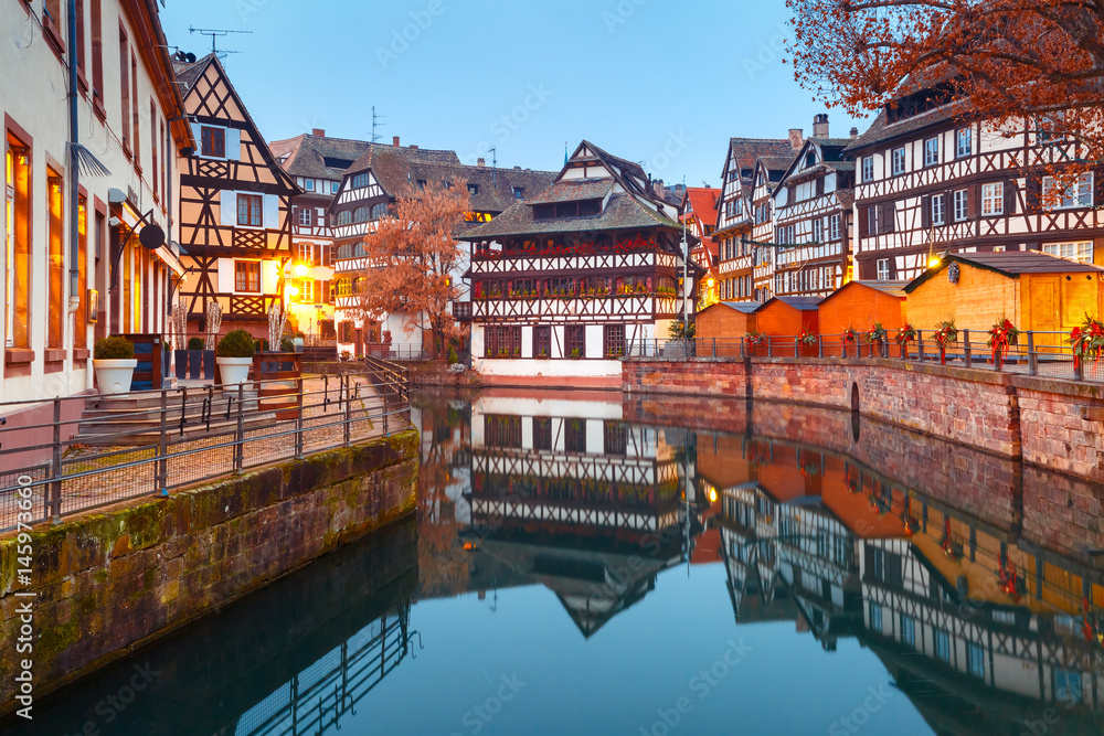 Traditional Alsatian half-timbered houses in Petite France with mirror reflections during morning blue hour, Strasbourg, Alsace, France