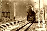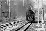 A steam locomotive in clouds of smoke traveling along a railway in winter