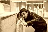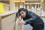 male customer choosing flakeboard or Oriented strand board OSB in the supermarket. Buying Construction and building material. Man is measuring sterling board