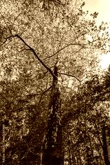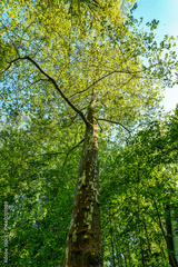 Platanus hispanica, London plane in the World Forest, Weltwald in Freising, Germany. Large tree with rounded crown