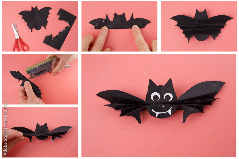 Playful bat craft with folded wings, googly eyes, and white fangs made from black paper, perfect for Halloween kids workshops, DIY content, craft tutorials, creative classrooms