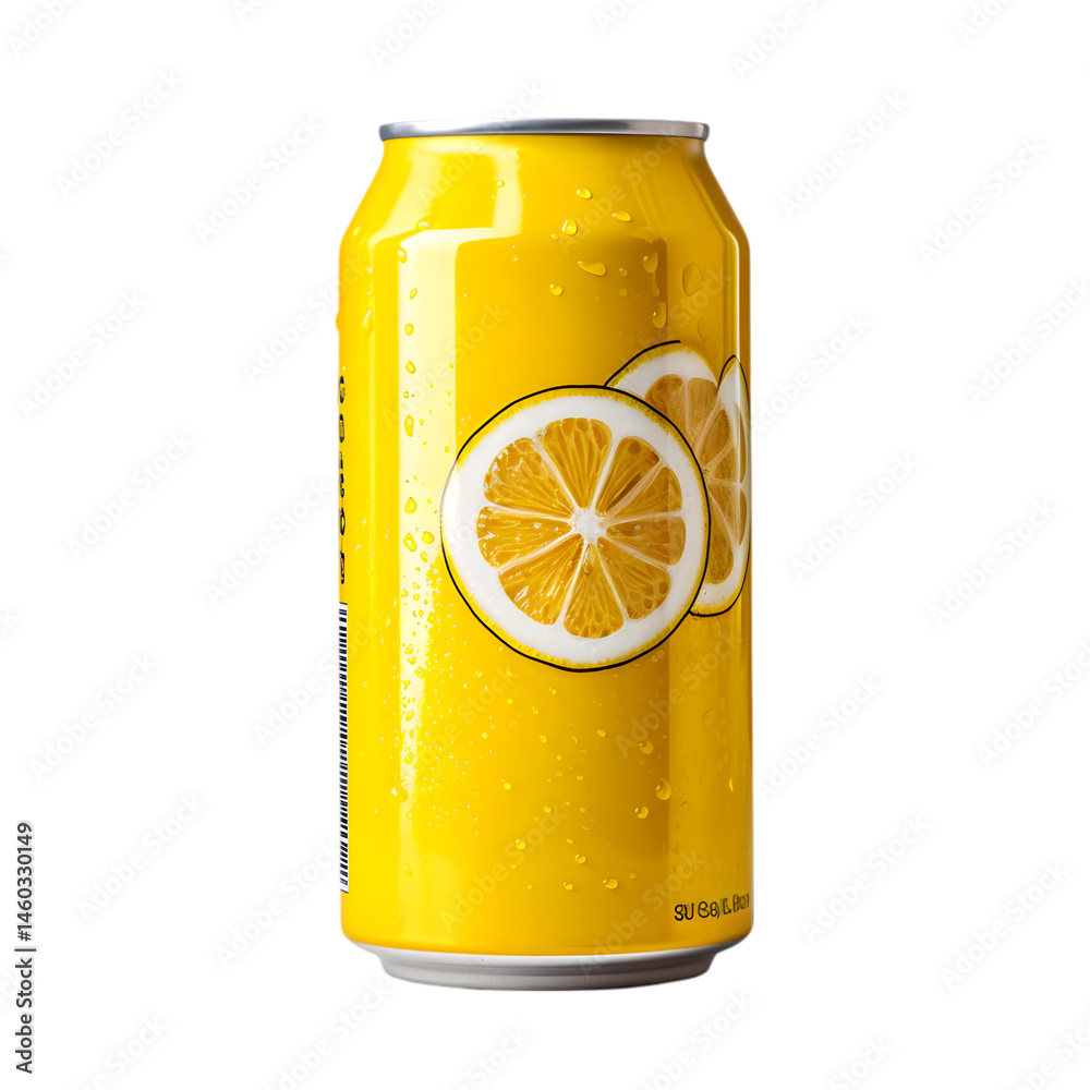 A yellow PNG soda can with lemon slices on the side against a transparent background in a studio shot