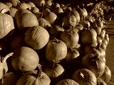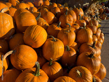 A view of a display of pumpkins glowing in the afternoon sunlight.