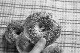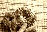 A top down view of a hand holding an everything bagel.