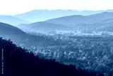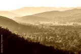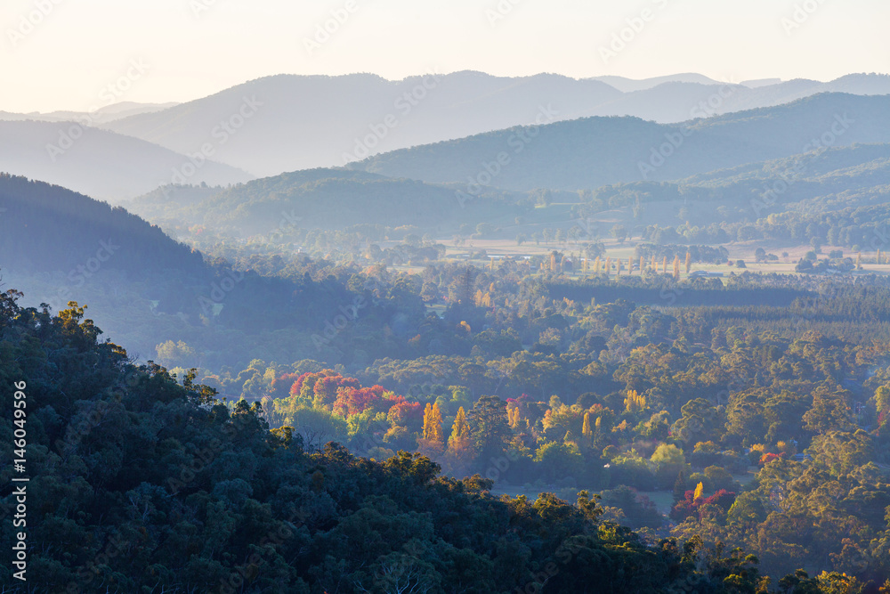 Sunset over Australian countryside - misty hills and fall trees. Victoria, Australia