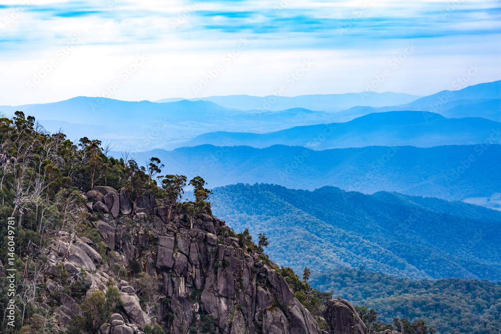 Mount Buffalo National Park - Rocks and layers of blue hills. Victoria, Australia