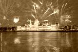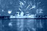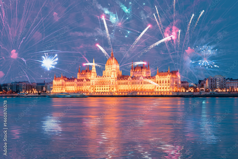 Hungarian parliament with fireworks in Budapest at twilight blue hour - Budapest, Hungary