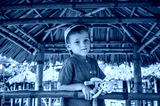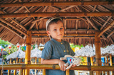 Portrait of a Caucasian schoolboy child boy on a playground in summer
