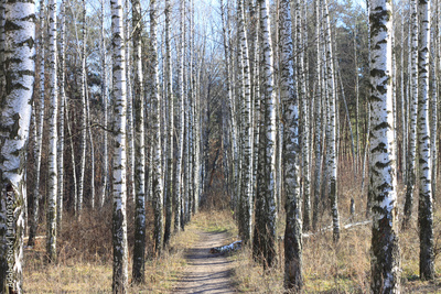 Trunks of birch trees in forest / birches in sunlight in spring / birch trees in bright sunshine / birch trees with white bark / beautiful landscape with white birches
