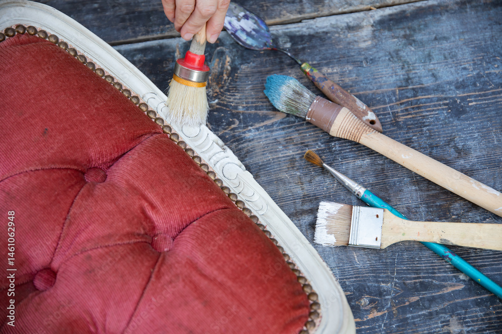 Painting a vintage, elegant armchair outdoors, an eco-friendly re-use business.