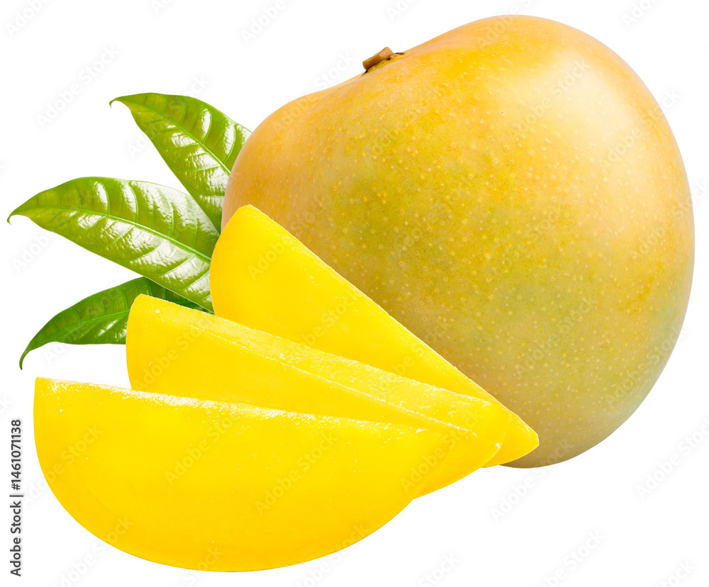 Yellow Mango fruit isolated on white background, Mango fruit with leaves on white PNG file.