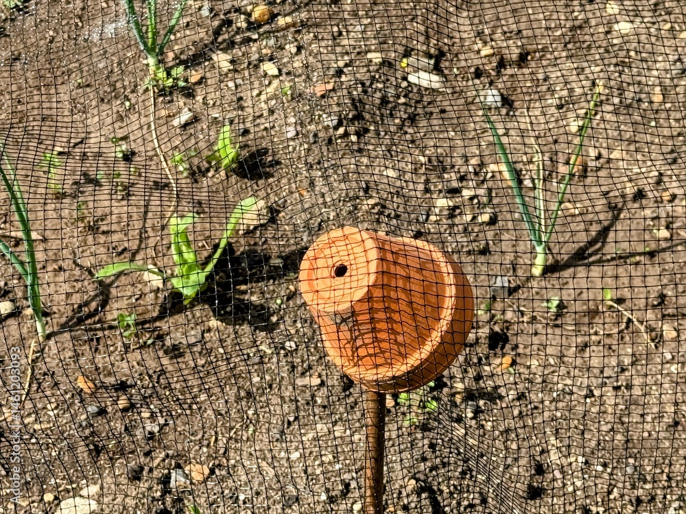 Vegetable bed in spring with terracotta pot on end of stick