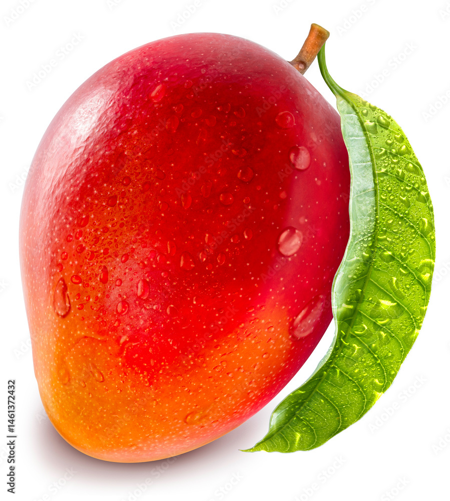 Red Mango fruit isolated on white background, Mango fruit with leaves on white With clipping path, High resolution focus stacking photography.