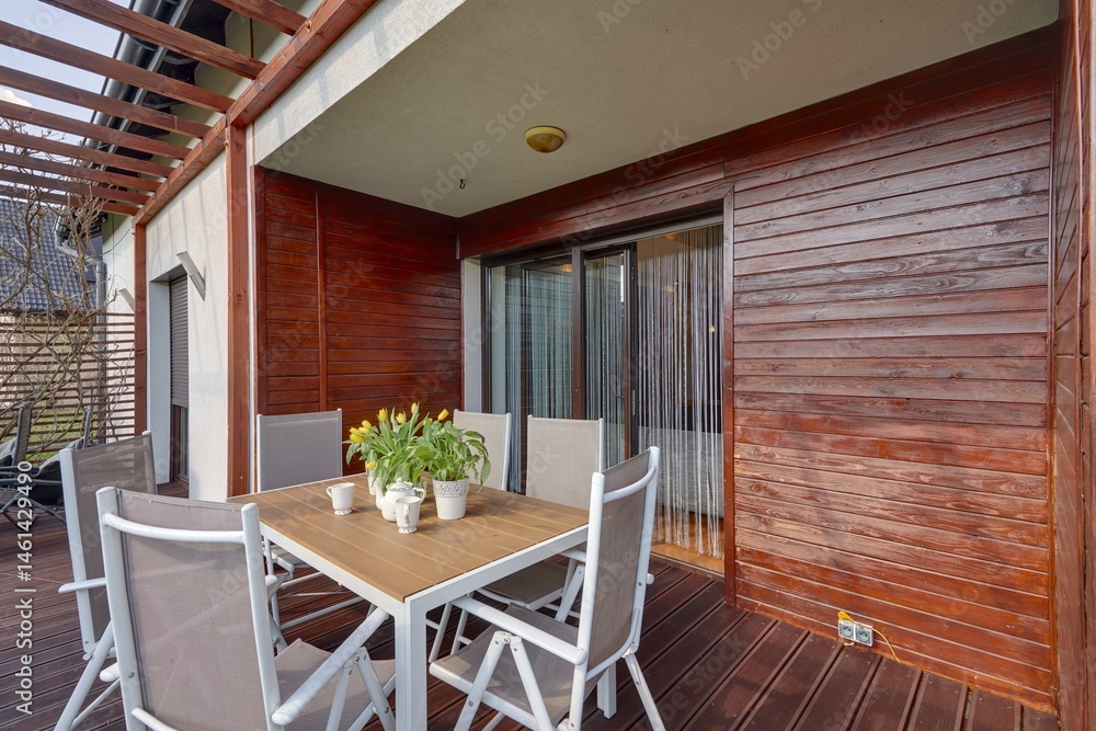 Taras drewniany z białymi meblami ogrodowymi w domu jednorodzinnym – ogród