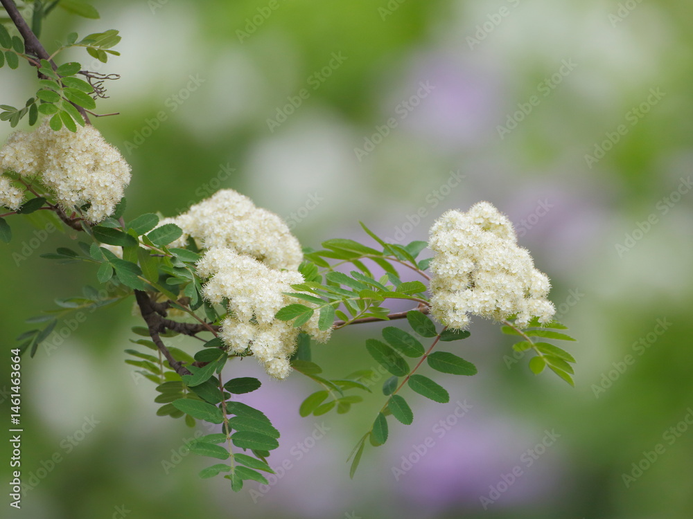 Mountain Ash tree branch with cluster of white flowers., selective focus.