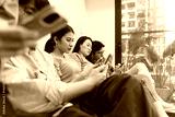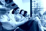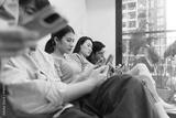 Group of young adults focused on smartphones while sitting together in a modern urban space