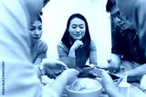 Group of friends enjoying snacks while using smartphones in a casual indoor setting during an afternoon gathering