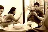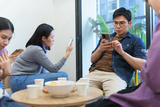 Group of friends engaged with their smartphones while enjoying a casual gathering indoors during a sunny day