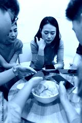Group of young adults enjoying snacks while focusing on their smartphones in a cozy indoor setting