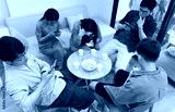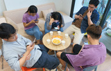 Group of friends enjoying snacks and texting while seated at a small table in a cozy indoor setting