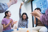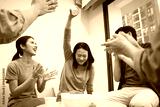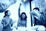 Friends celebrating joyfully during a gathering in a cozy apartment at dusk in the city