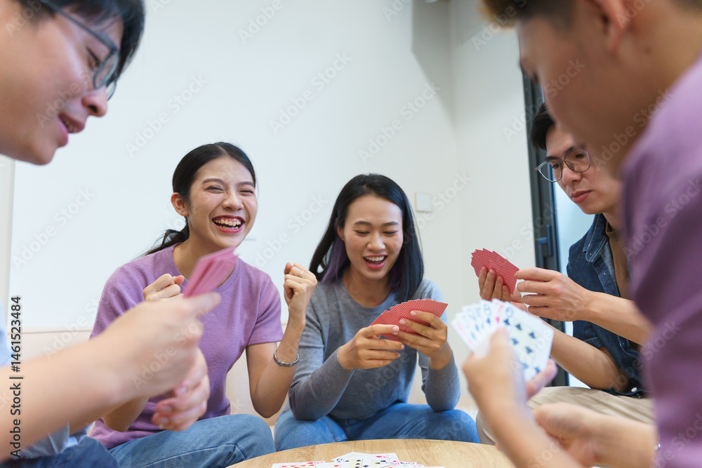 Group of friends enjoying a fun card game in a cozy indoor space during the afternoon