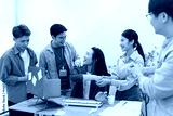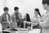 Team celebrates project success with a handshake and smiles in a modern office environment
