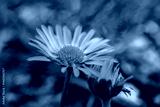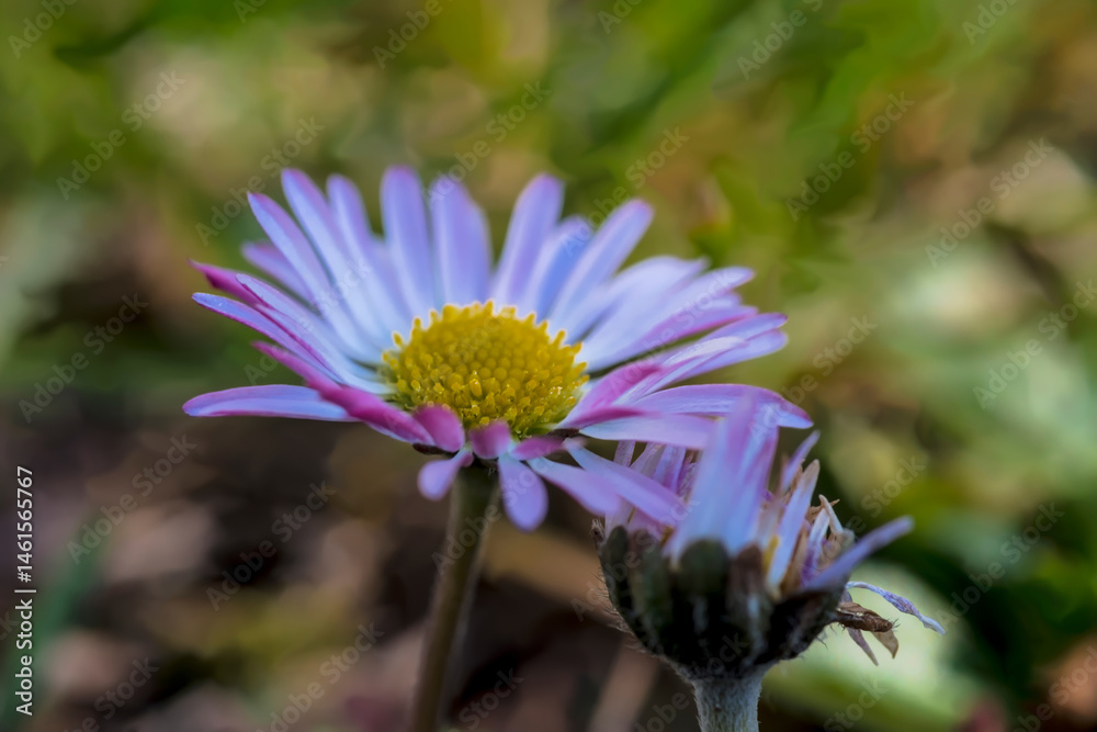 Zbliżenie dzikiej stokrotki (Bellis perennis) z fioletowymi płatkami i jasnożółtym środkiem wyrastająca w naturze. Delikatne płatki kwiatu są smukłe i rozchodzą się promieniście na zewnątrz